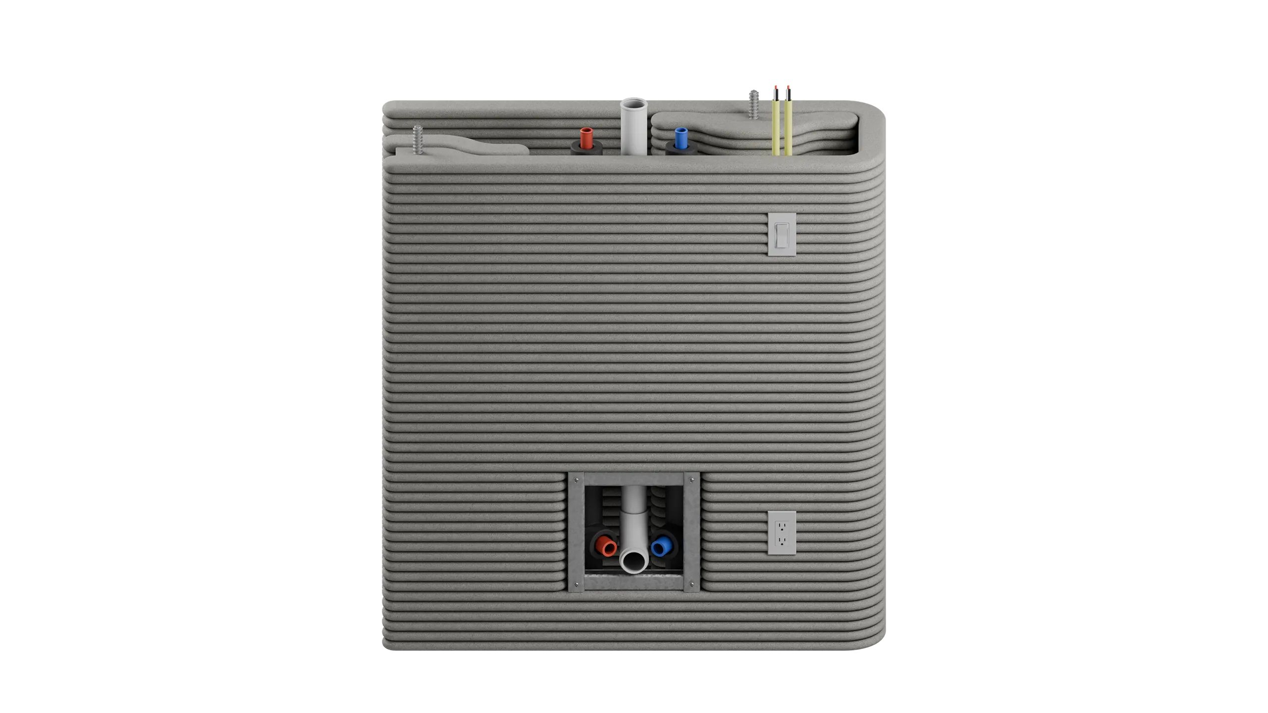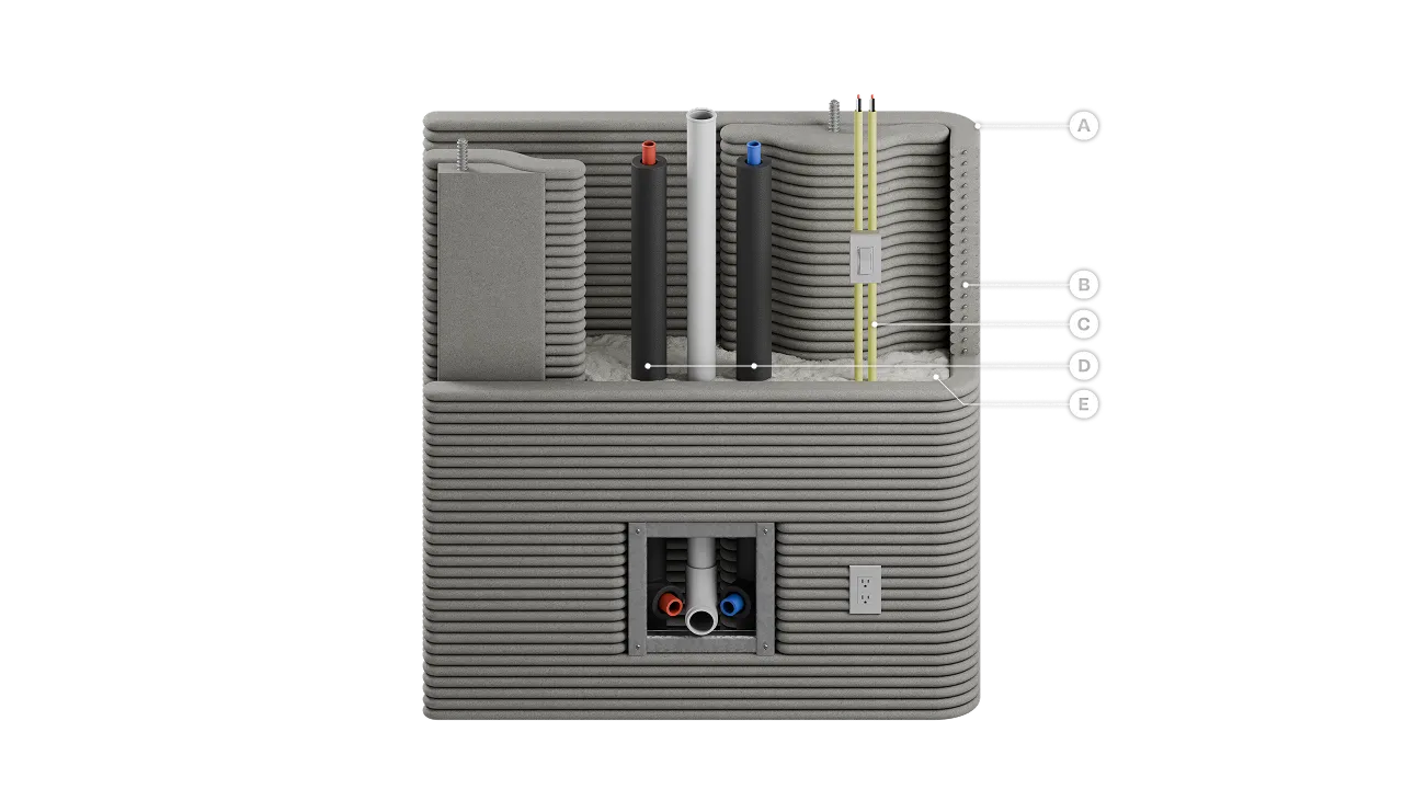 ICON’s 3D-printed double-shell wall system extrudes rapidly curing CarbonX to form a monolithic, load-bearing assembly with alternating reinforced cores, a continuous insulated cavity for MEP routing, and uninterrupted load paths that eliminate traditional formwork and jointed construction.
